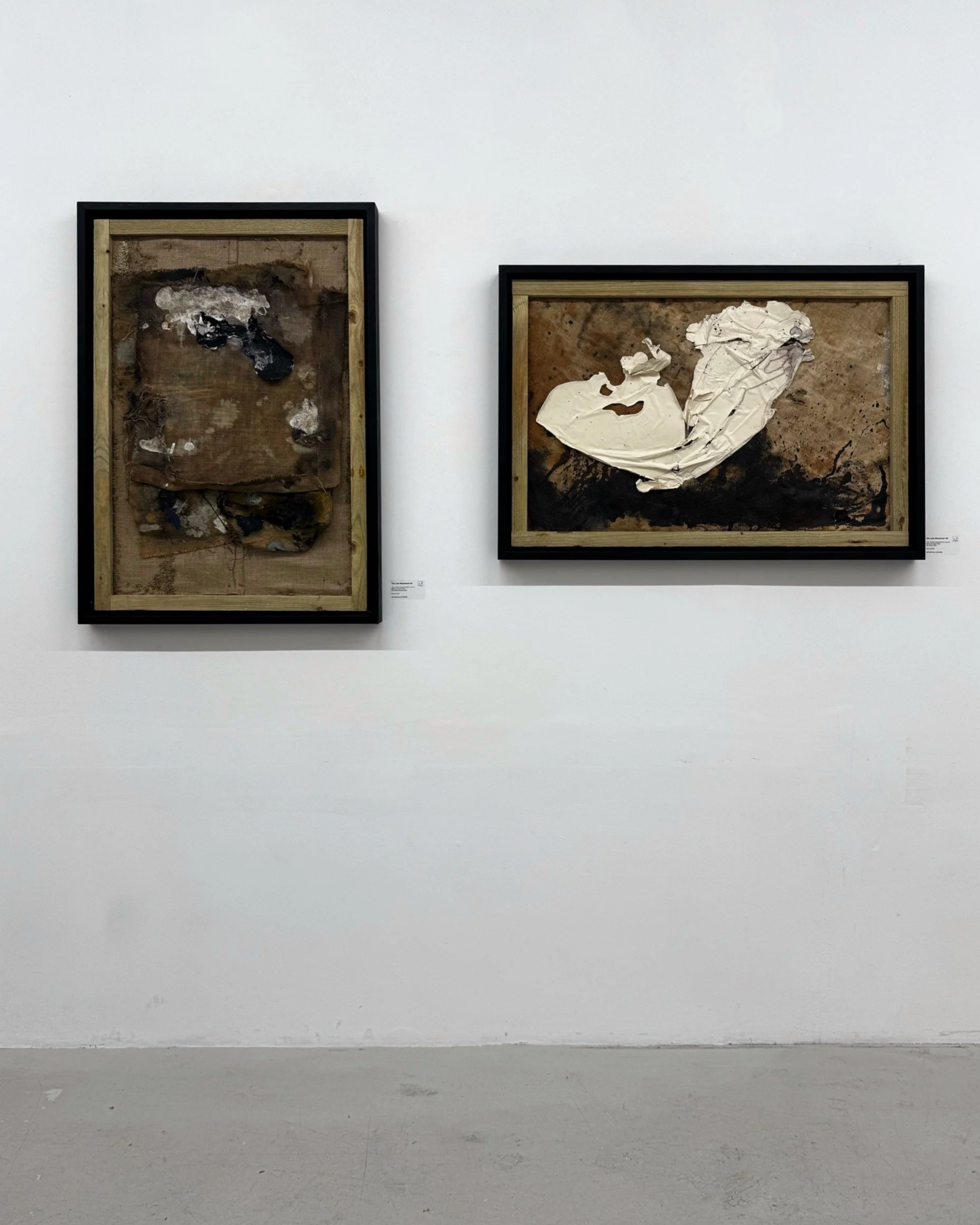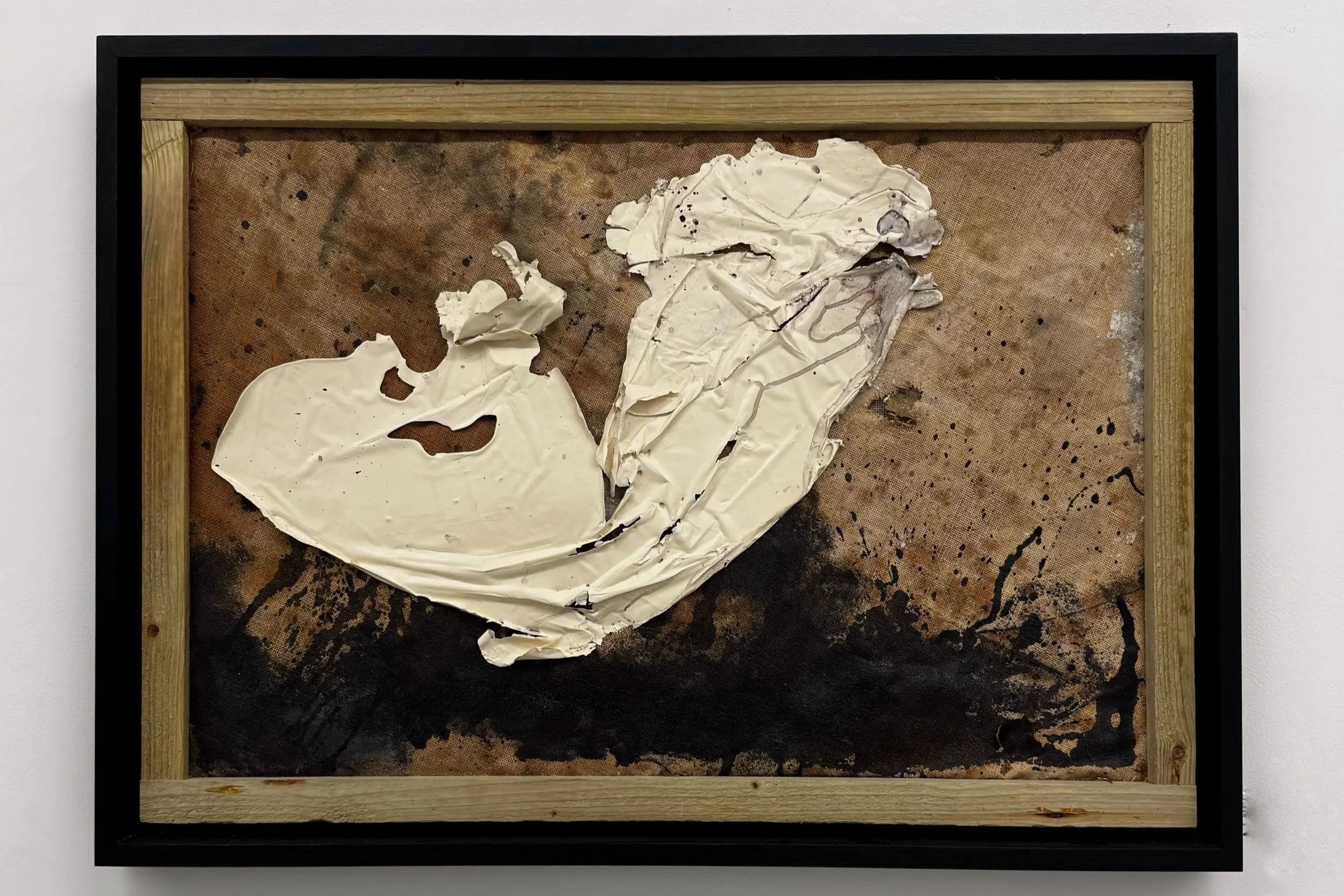Inner Layer (85cm x 55cm) Jute, thread, Household paint, Ink, Bleach. Peeled poured paint, Aviary Panel (93.4cm x 64.6cm): Aviary Panel (93.4cm x 64.6cm): thread, Household paint, Ink, boat varnish